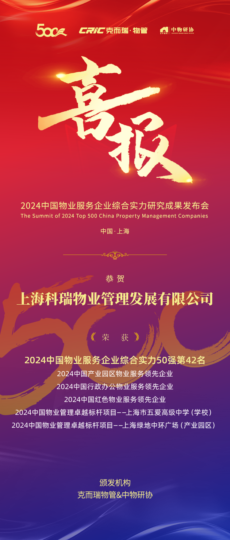 8月22日,2024中國(guó)物業(yè)服務(wù)企業(yè)綜合實(shí)力研究成果發(fā)布會(huì)在上海舉辦。來自全國(guó)各地的30余家省市級(jí)物業(yè)協(xié)會(huì)會(huì)長(zhǎng)、秘書長(zhǎng),50余位大咖嘉賓,近600位物業(yè)上下游產(chǎn)業(yè)鏈的行業(yè)同仁齊聚。會(huì)議發(fā)布了“2024中國(guó)物業(yè)服務(wù)企業(yè)綜合實(shí)力500強(qiáng)”“2024中國(guó)物業(yè)服務(wù)企業(yè)綜合實(shí)力細(xì)分領(lǐng)域”“2024中國(guó)物業(yè)管理卓越標(biāo)桿項(xiàng)目”等一系列研究成果,以物業(yè)綜合實(shí)力領(lǐng)域權(quán)威成果為行業(yè)樹立了年度風(fēng)向標(biāo)。 在「2024中國(guó)物業(yè)服務(wù)企業(yè)綜合實(shí)力研究成果」中,科瑞物業(yè)憑借穩(wěn)健的財(cái)務(wù)表現(xiàn)、卓越的運(yùn)營(yíng)能力和良好的服務(wù)口碑,榮獲“2024中國(guó)物業(yè)服務(wù)企業(yè)綜合實(shí)力50強(qiáng)第42名”,較去年提升4位。 榮獲“2024中國(guó)產(chǎn)業(yè)園區(qū)物業(yè)服務(wù)領(lǐng)先企業(yè)”“2024中國(guó)行政辦公物業(yè)服務(wù)領(lǐng)先企業(yè)”以及“2024中國(guó)紅色物業(yè)服務(wù)領(lǐng)先企業(yè)”。 榮獲“2024中國(guó)物業(yè)管理卓越標(biāo)桿項(xiàng)目——上海市五愛高級(jí)中學(xué)(學(xué)校)”“2024中國(guó)物業(yè)管理卓越標(biāo)桿項(xiàng)目——上海綠地中環(huán)廣場(chǎng)(產(chǎn)業(yè)園區(qū))”共計(jì)六項(xiàng)榮譽(yù)。