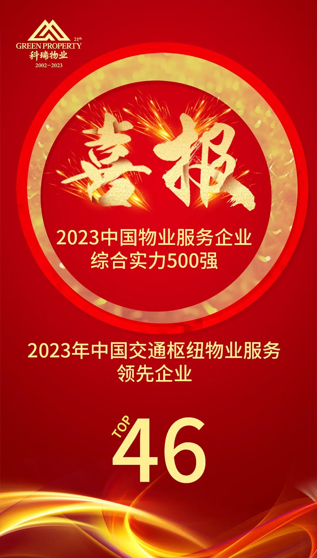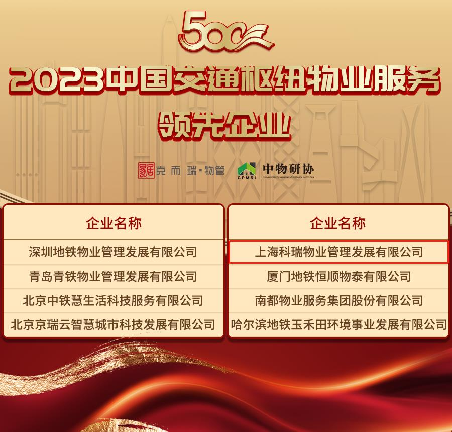 6月28日,克而瑞物管和中物研協隆重發(fā)布2023中國物業(yè)服務企業(yè)研究成果,同期揭曉2023中國物業(yè)服務企業(yè)綜合實力500強企業(yè),科瑞物業(yè)憑借強大的綜合實力,榮膺“2023年中國交通樞紐物業(yè)服務領先企業(yè)”、“2023中國物業(yè)服務企業(yè)綜合實力500強” 第46位,排名較上年再提升2位。